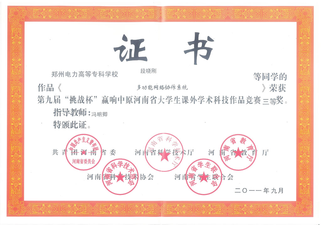 段晓刚、张善法同学获第九届“挑战杯”河南省老员工课外学术作品竞赛三等奖